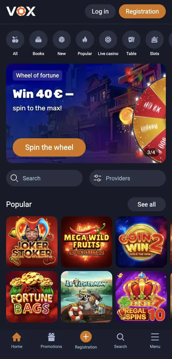 Registration is designed for a small screen, with simple form fields and clear prompts. Inside the Vox Casino app, you can check balance, view bonus status, and open the cashier for deposits or withdrawals. The promotions area also makes it easy to review a Vox bonus and join VIP or daily slot tournaments when available.